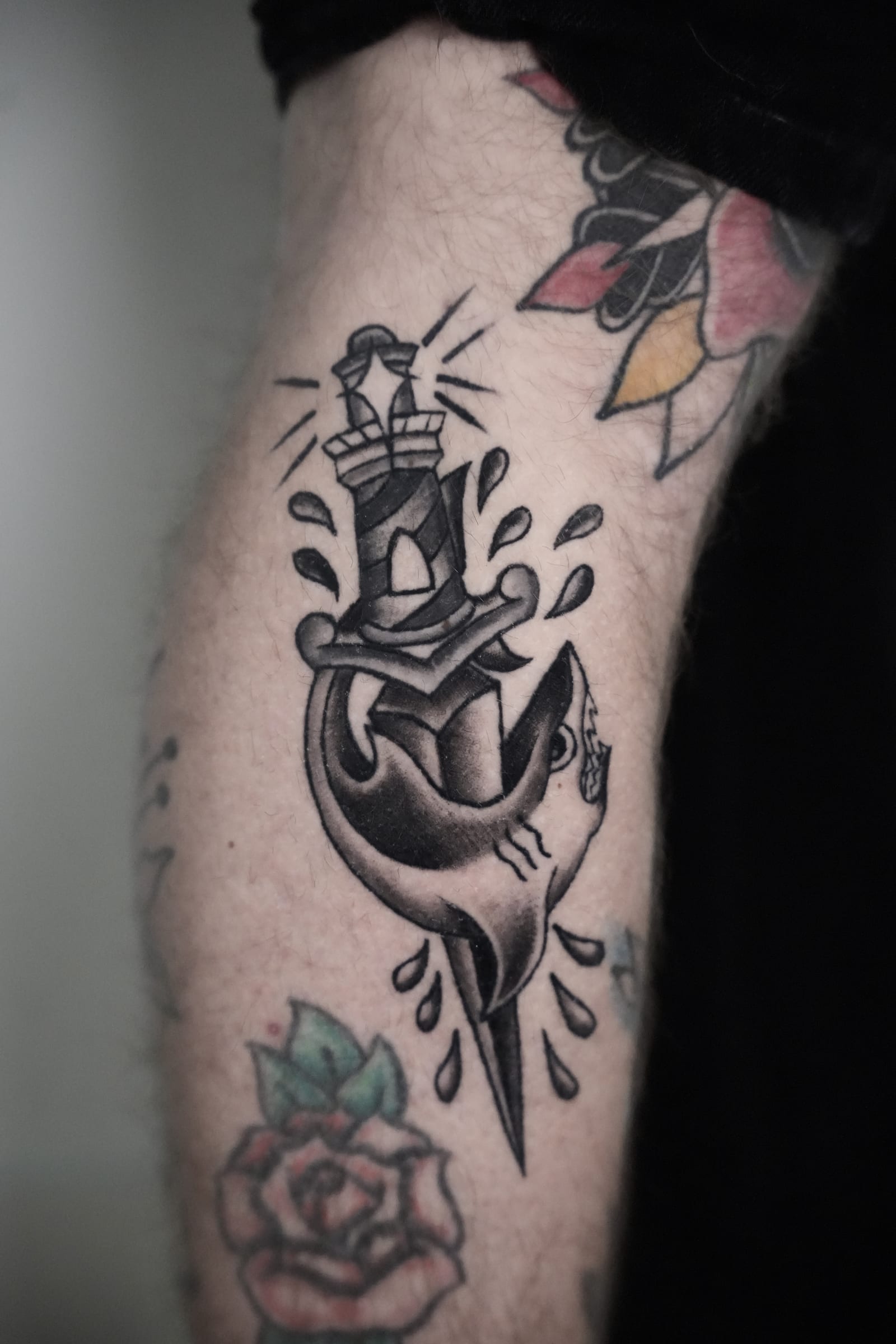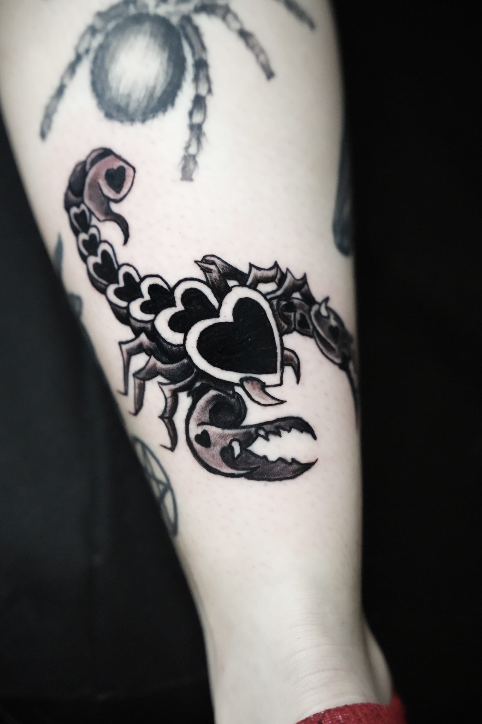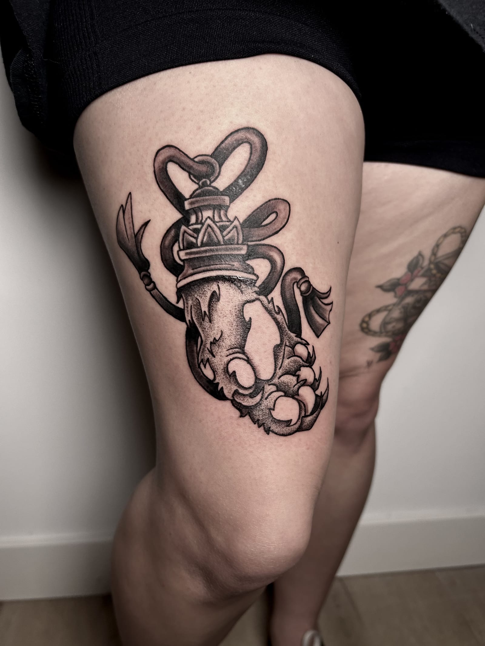 Her style leans toward blackwork and illustrative tattooing, often featuring bold outlines paired with smooth shading techniques that add depth without overpowering the design. This balance allows her tattoos to stand out while remaining refined and wearable over time.